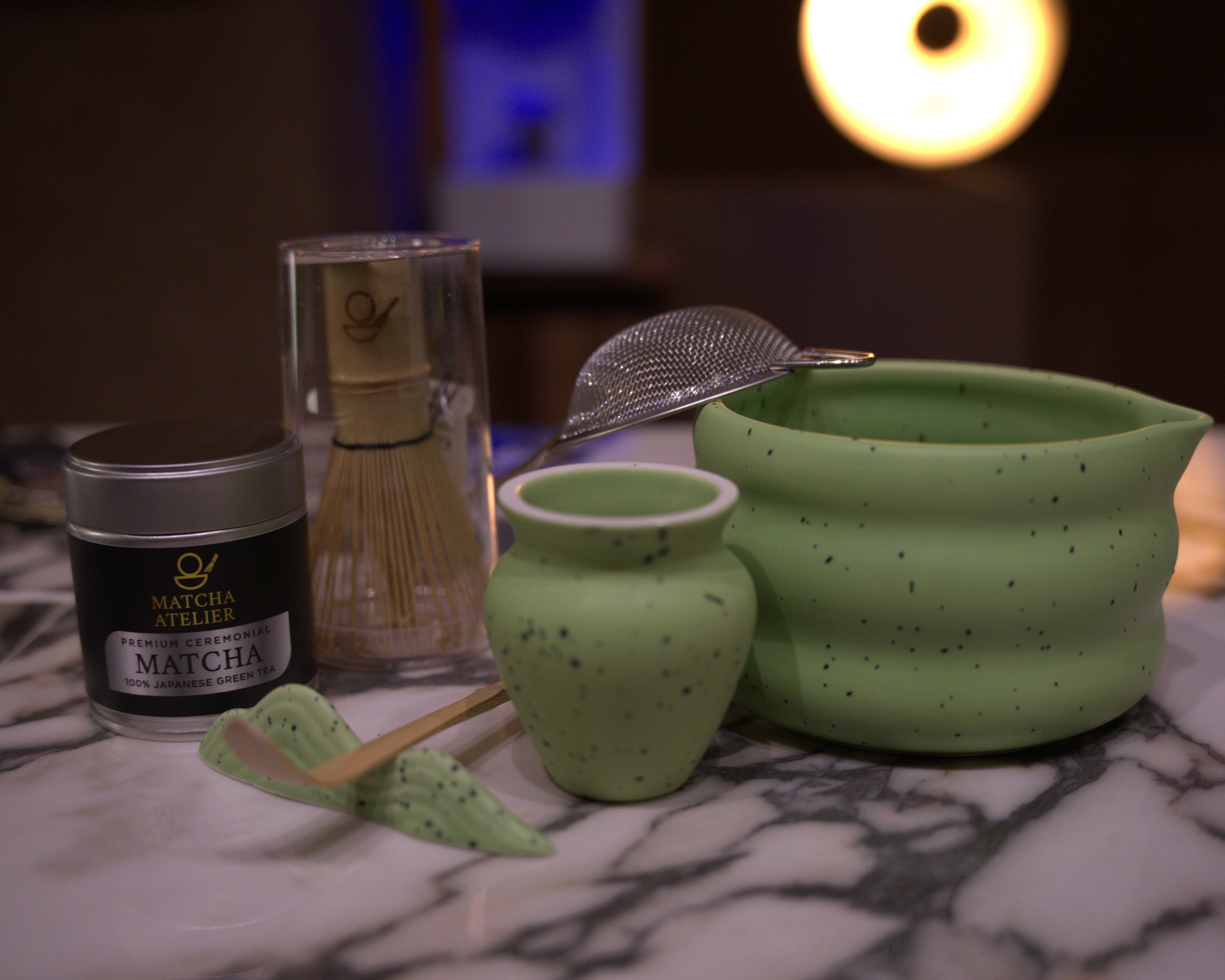 A complete expression of the matcha ritual, thoughtfully assembled for moments of mindful preparation. This refined kit brings together essential handcrafted tools including a ceremonial bowl, bamboo whisk, and complementary accessories, designed to elevate each step from measure to pour. Paired with timeless aesthetics and artisanal quality, it transforms the preparation of matcha into a quiet luxury ritual where tradition, balance, and intention meet.
